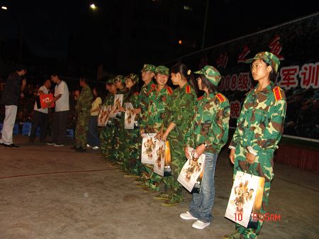 老生代表拉开了晚会的序幕,一支由五位着彝族服装的女生表演的彝族舞蹈《玩场》,舞出彝族女孩的热情,将全场的思绪带向遥远之外的大梁山;三连的小品《老师你们辛苦了》和二连的小品《军训风采》运用诙谐的方式最终引向深邃的主题,笑声、感动、思考是它们带给晚会的表情;五连和七连的两支佤族舞蹈,不同的舞蹈编排演绎出同样的精彩,深深催化着在场观众了解佤文化的强烈愿望;八连的舞蹈《印佳女孩》,印度文化带来的感官冲击招来一片片的掌声和喝彩,即使中场开始出现音乐空白,观众带节奏的掌声和舞者依旧的婀娜舞姿传达出舞台上下的和谐、克服小尴尬的智慧;九连几个可爱的女生踏着动感的舞步,搭着《爱你》欢快的旋律翅膀,挥洒青春的骄傲和激情;六连列出“心”的形状深情歌唱《感恩的心》,耳熟能详的旋律挡不了台下观众们的轻声和唱;教官们的格斗基本功表演,整齐、刚劲有力、雄浑、气撼山河,台下喝彩声一浪高过一浪;指导员合唱的《中国人》让新生们看到了舞台上不一样的老师。。。。。。节目中间穿插的抽奖环节,“贵人鸟”把关怀和惊喜送给离家在外的新生们。